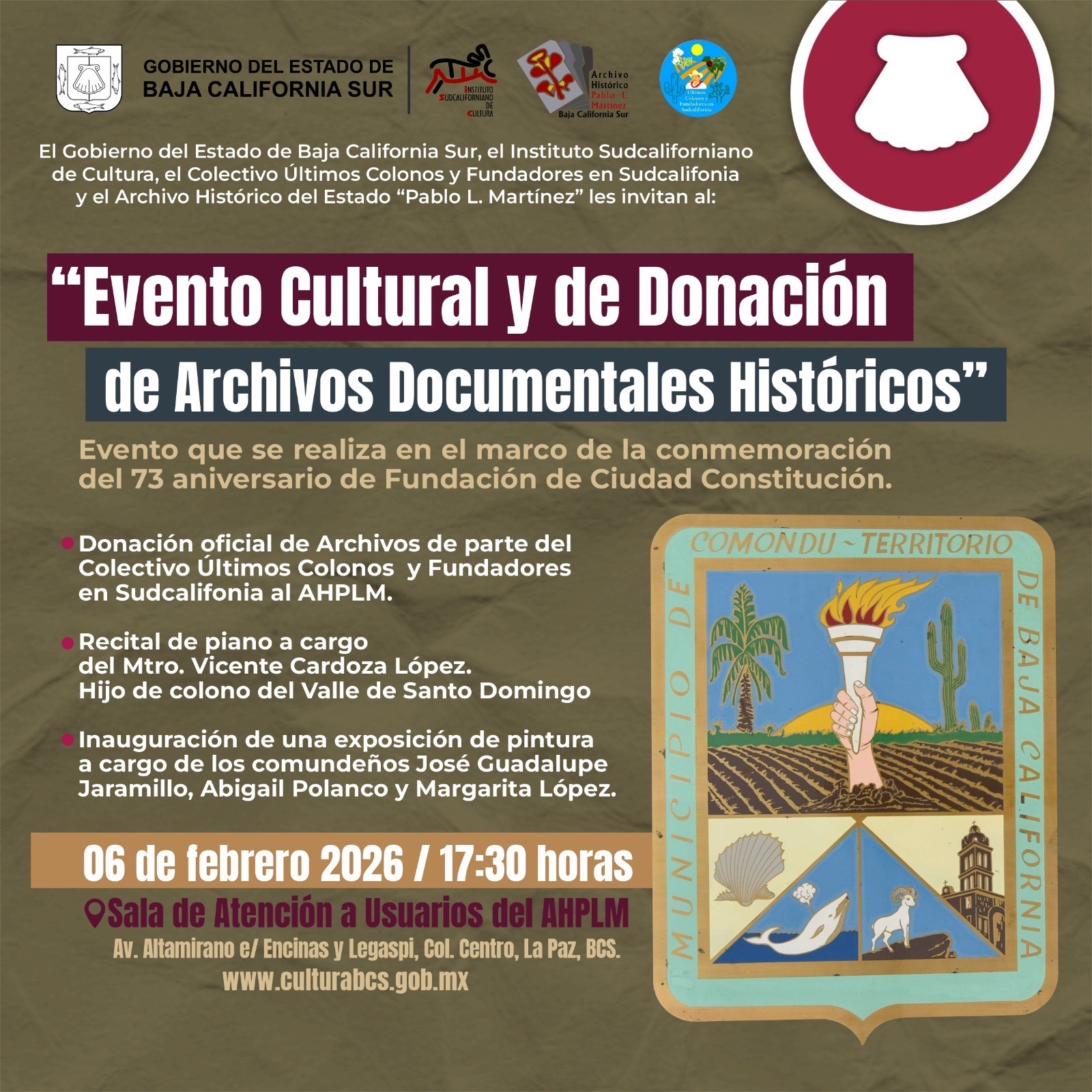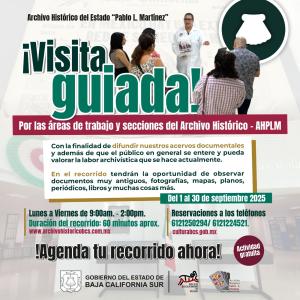 El Gobierno del Estado de Baja California Sur, el Instituto Sudcaliforniano de Cultura, el Colectivo Últimos Colonos y Fundadores en Sudcalifonia y el Archivo Histórico del Estado “Pablo L. Martínez” les invitan al