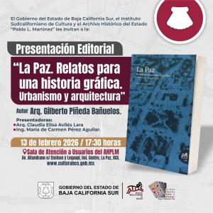 El Gobierno del Estado de Baja California Sur, el Instituto Sudcaliforniano de Cultura, el Colectivo Últimos Colonos y Fundadores en Sudcalifonia y el Archivo Histórico del Estado “Pablo L. Martínez” les invitan a la Presentación Editorial:
