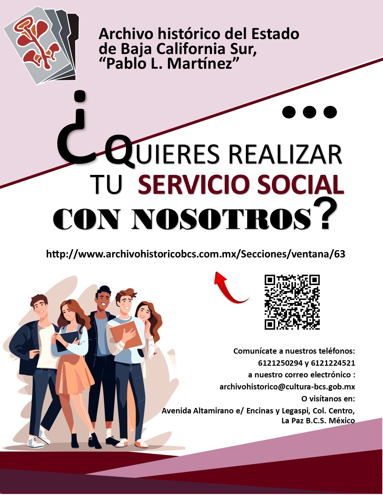 El Archivo Histórico del Estado de Baja California Sur, les hace la mas cordial invitación a realizar su servicio social y capacitarte del conocimiento archivístico, dentro de nuestras diferentes áreas de trabajo como son: