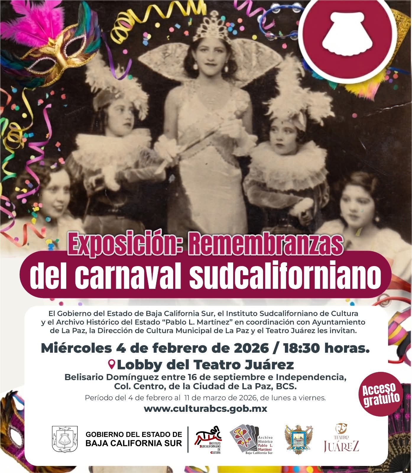 El Gobierno del Estado de Baja California Sur, el Instituto Sudcaliforniano de Cultura, y el Archivo Histórico del Estado “Pablo L. Martínez”, en coordinación con el Ayuntamiento de La Paz, La dirección de Cultura Municipal de LA Paz y el Teatro Juárez les invitan a visitar la Exposición: